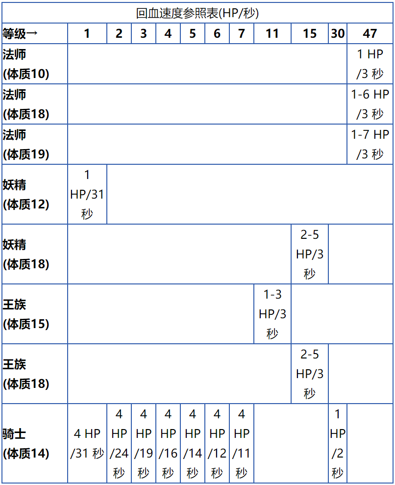 回血速度主要取决于等级、体质、职业这三种因素而决定的。由于这十分的复杂,目前下表为其回血速度表,不过尚未完成。(看看就好)